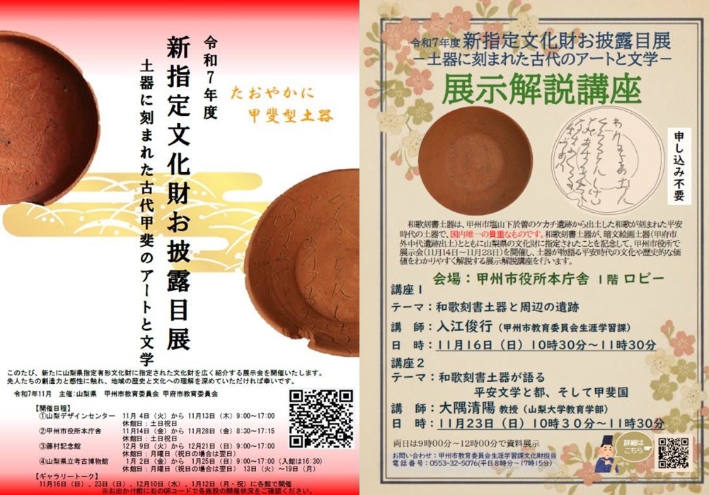 弊社の文化財調査課 泉調査員が担当した「甲州市塩山のケカチ遺跡」から出土した和歌刻書土器が、暗文絵画土器(甲府市外中代遺跡出土)と共に新たな県指定文化財に指定されました。これを記念し、下記のとおり展示会及び講座が開催されています。