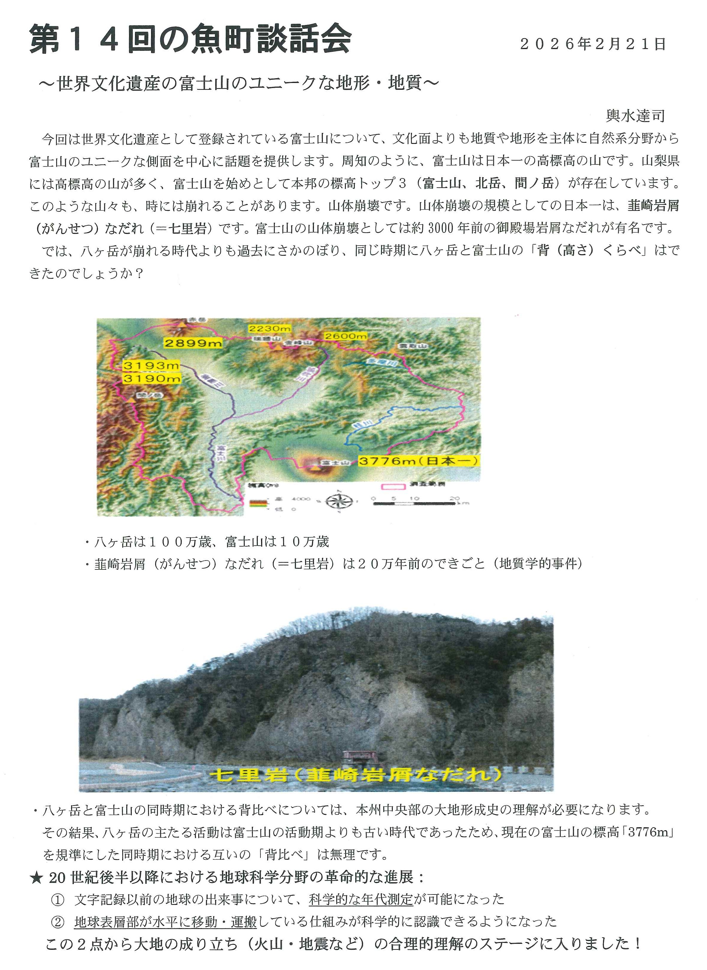 令和2年に修復した「魚町松亭の蔵」にて地元の皆様と共に甲府市内や山梨県内に関する人文・文化財・自然科学にわたる知見を広める場所として活用するため、14回目の「魚町談話会」を企画し、地元の方々との談話会を令和8年2月21日に開催いたしました。これからも定期的に開催していきます。
