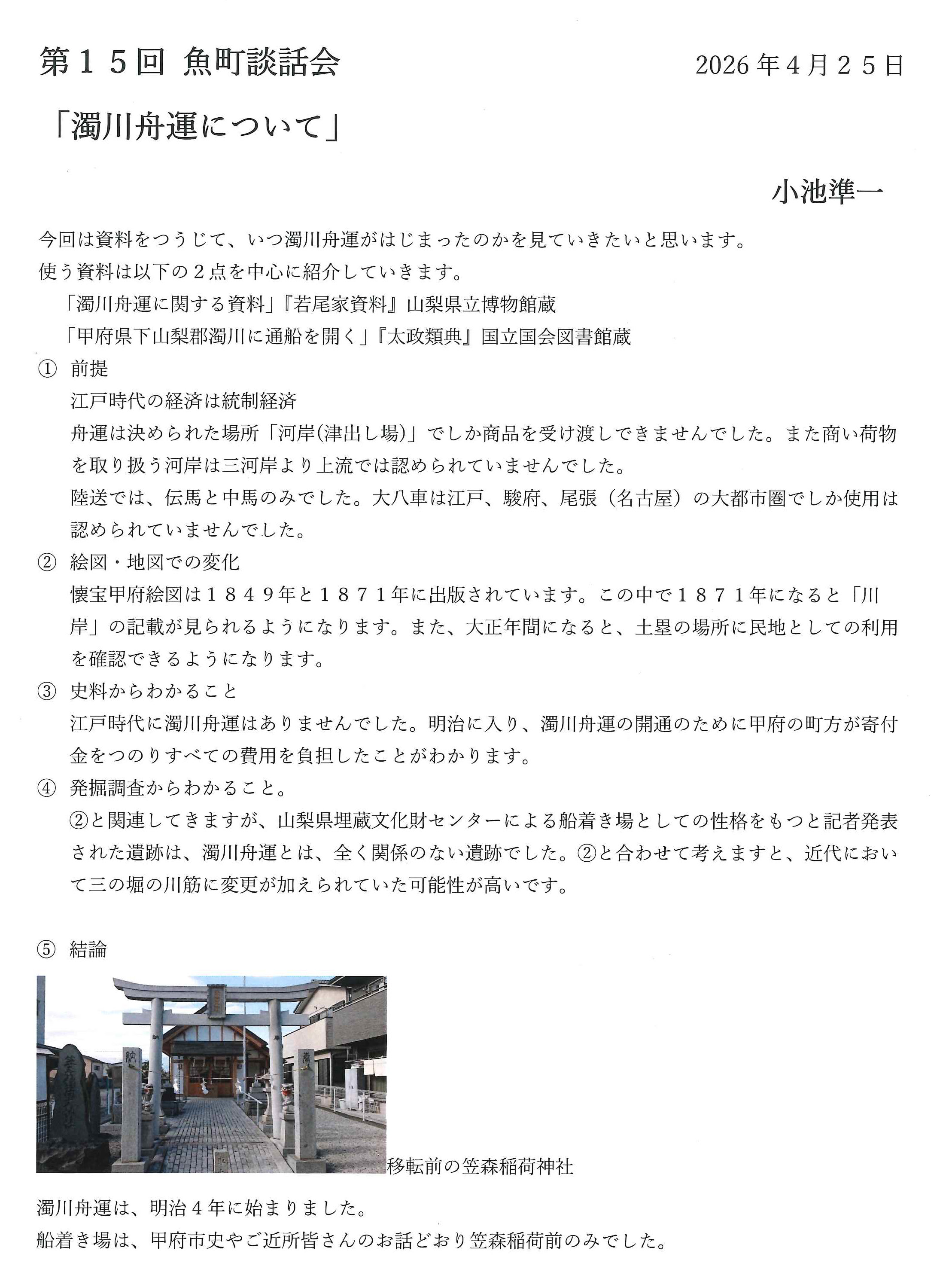 令和2年に修復した「魚町松亭の蔵」にて地元の皆様と共に甲府市内や山梨県内に関する人文・文化財・自然科学にわたる知見を広める場所として活用するため、15回目の「魚町談話会」を企画し、地元の方々との談話会を令和8年4月25日に開催いたしました。これからも定期的に開催していきます。